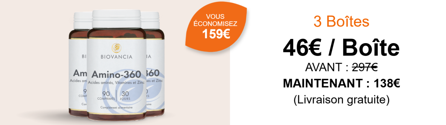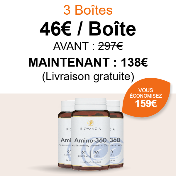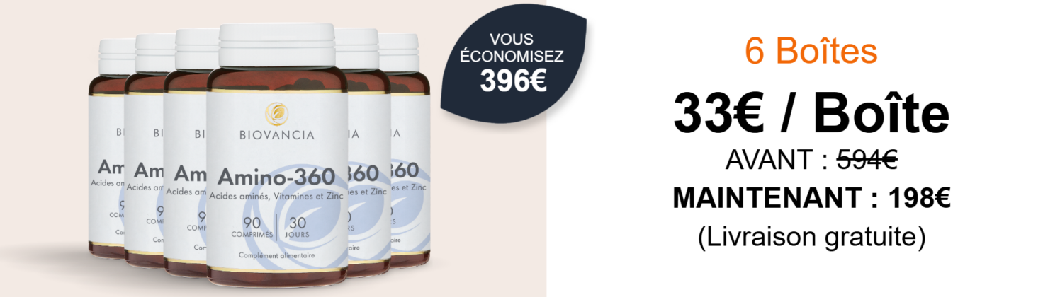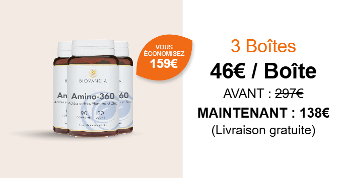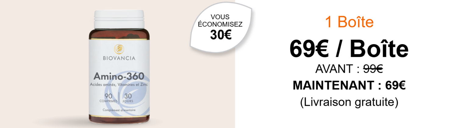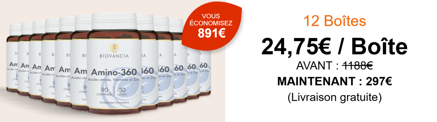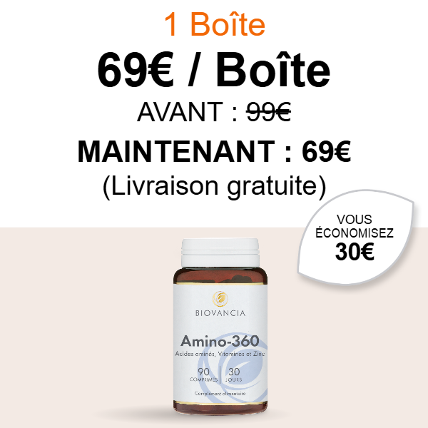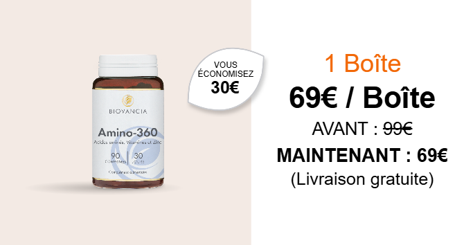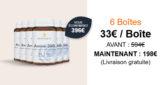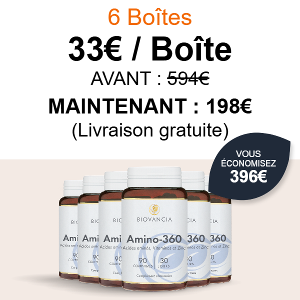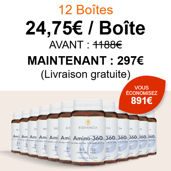 Amino-360 agit en contournant les faiblesses digestives liées à l’âge. Il fournit directement à votre organisme les 8 acides aminés essentiels, dans les proportions recommandées par l’Organisation Mondiale de la Santé (OMS).