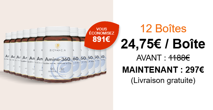 Amino-360 est notre première formule à base d’acides aminés essentiels conçue pour stimuler la production naturelle de protéines par votre corps, sans dépendre de votre alimentation.