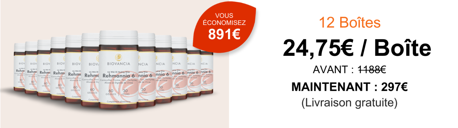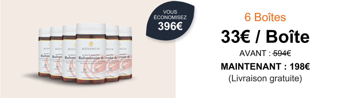 C’est l’alliance de 6 fabuleux actifs naturels : Rehmannia, Alisma, Yam, Cornouiller, Pachyme, Pivoine.