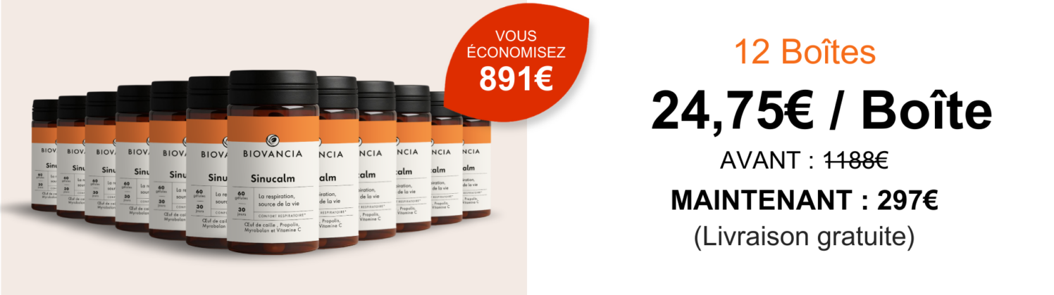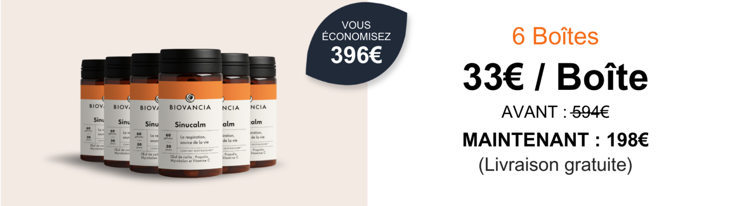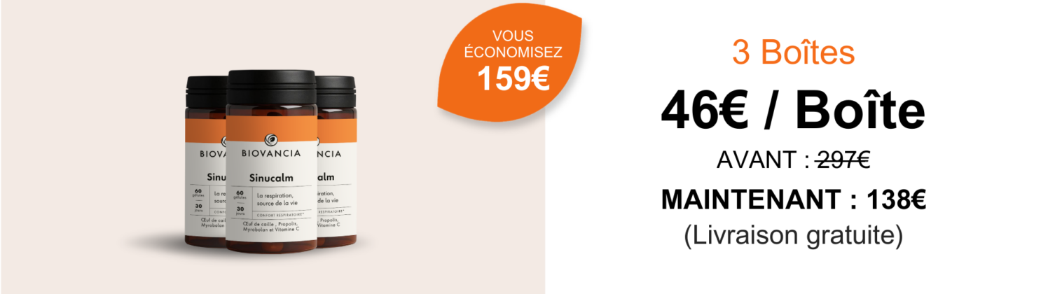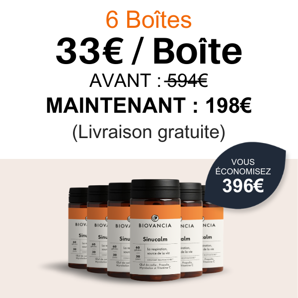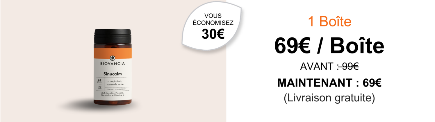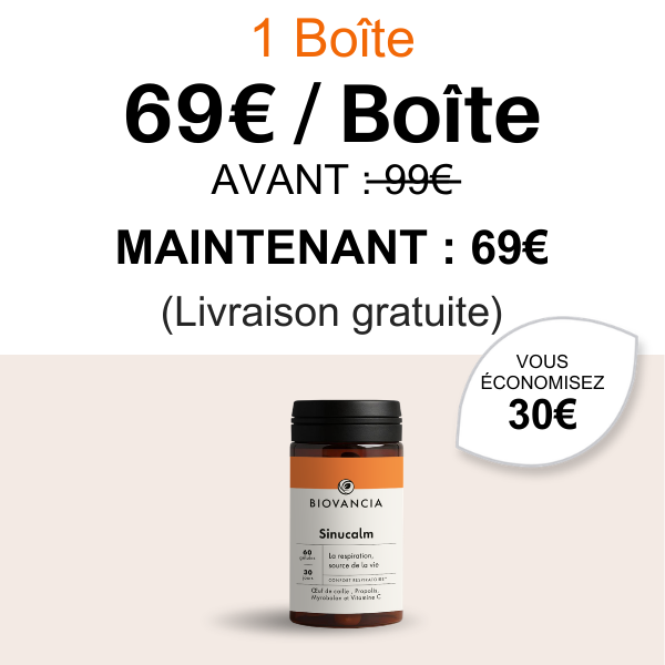 Sinucalm combine 4 nutriments indispensables pour améliorer la santé respiratoire et limiter les réactions allergiques : œuf de caille, propolis, myrobolan et vitamine C.