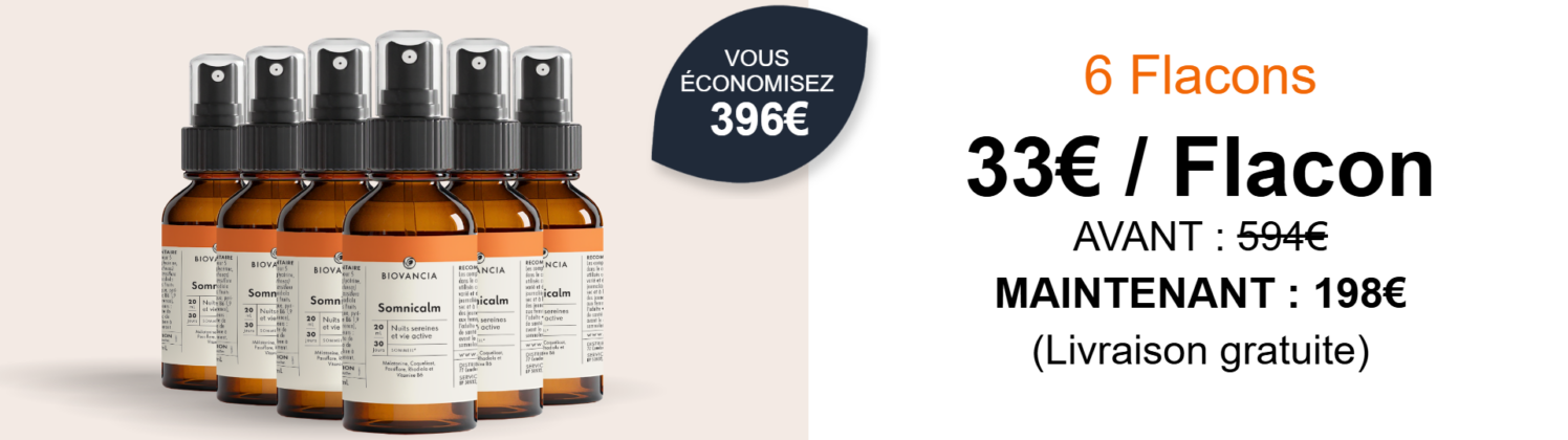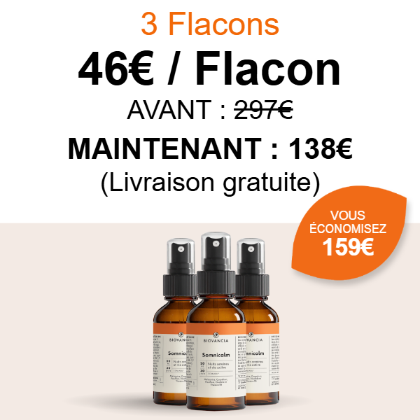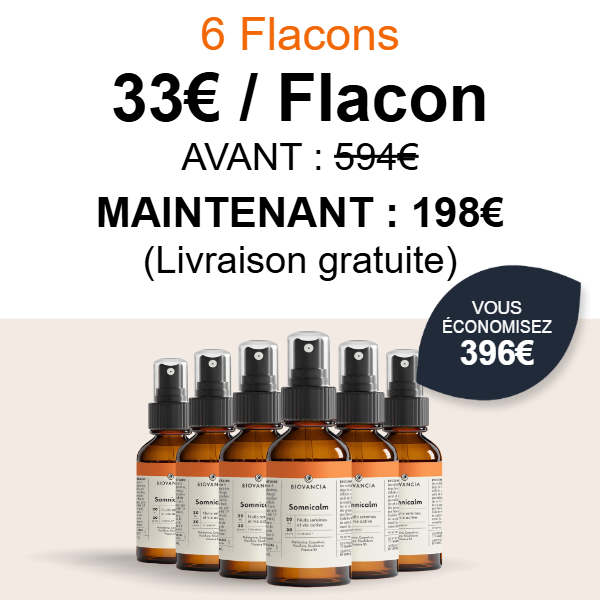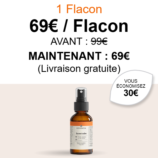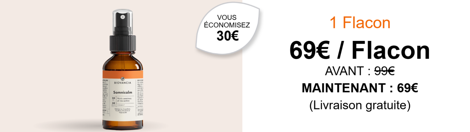 Somnicalm est une innovation Biovancia conçue pour corriger cette “disharmonie GABA–glutamate”. Sa formule associe 5 actifs d’origine naturelle (coquelicot, passiflore, rhodiola, vitamine B6 et mélatonine) dans un spray sublingual à absorption rapide. En quelques pulvérisations sous la langue, vous aidez votre cerveau à relâcher la pression, favorisez l’endormissement et prolongez la durée de votre sommeil profond, sans les effets « gueule de bois » de certains somnifères ou fortes doses de mélatonine.